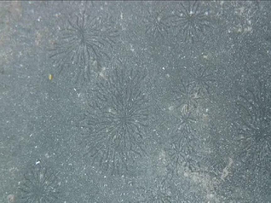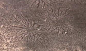 The pattern of excavated material is uniform and does not overlap other spiders. This may be the result of limited- charge-scavanging from only the areas which have available charge along the balanced-tendrils of the coronal aspect of the electrical interaction. |