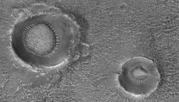 within, these two images are telling of the diverse capability of an electric discharge at making features that are seen around the solar system on solid bodies. In the smallest of detail these can be matched with features in full size. You may think I am deviating a bit from spider features until I tell you that the same discharge that made a feature on the left also made a feature on the right as two CRT screen were passed in close proximity. Three passes are represented. The similarities are further emphasized by the planetary images below from Mercury and Mars. | ![]() Note the interior fingers in the features of these two images. |